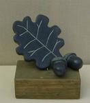 2013Herfst, eikenblad met twee eikels uit indiaas speksteen op houten sokkel (gebeitst)