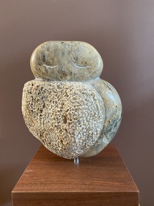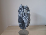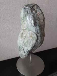2023Uil uit indiaas speksteen op stalen sokkel.